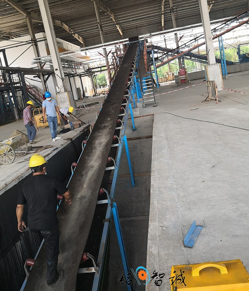 旋转式皮带输送机其结构是在平形橡胶运输带两侧粘上可自由伸缩的橡胶波形立式"裙边”, 在裙边之间又粘有一定强度和弹性的横隔板组成匣形斗,使物料在斗中进行连续输送。挡边带式输送机可广泛用于煤炭、粮食、建材、化工、水电和冶金等部门,在环境温度为- 19°C ~ +40°C范围内,输送堆积比重为0.5-2.5t/m3的各种散状物料。对于输送有特殊要求的物料,如高温、具有酸、碱性、油类物质或有机溶剂等成分的物料,需采用特殊的挡边输送带。